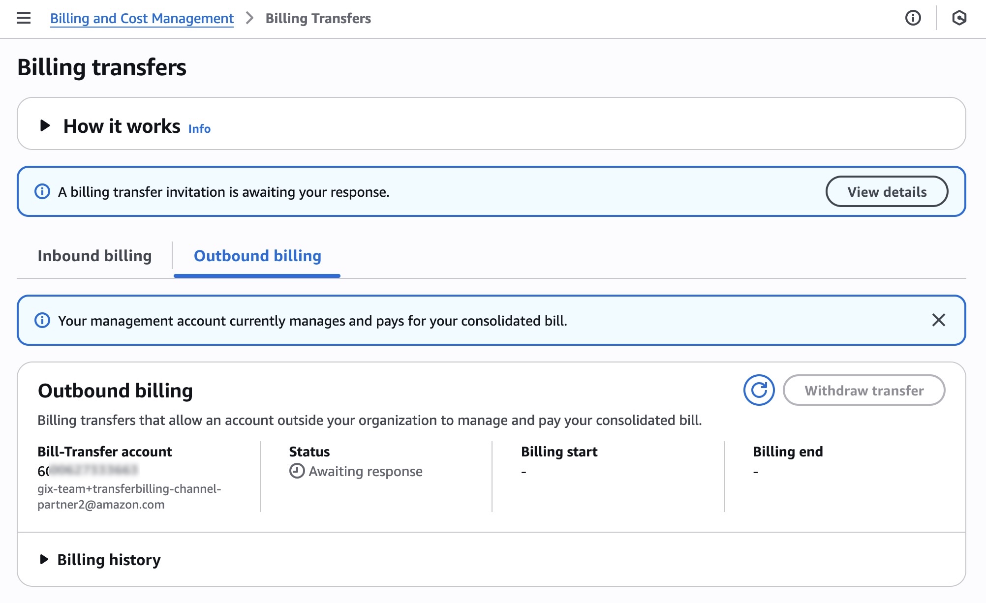 To learn more about details, visit Billing Transfer in the AWS documentation.