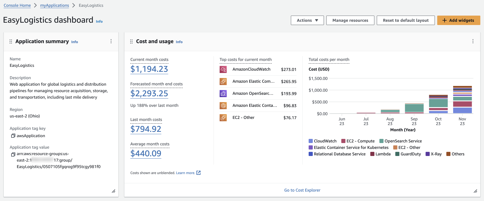 The Application summary widget displays the name, description, and tag so you know which application you are working on. The Cost and usage widget visualizes your AWS resource costs and usage from AWS Cost Explorer, including the application’s current and forecasted month-end costs, top five billed services, and a monthly application resource cost trend chart. You can monitor spend, look for anomalies, and click to take action where needed.