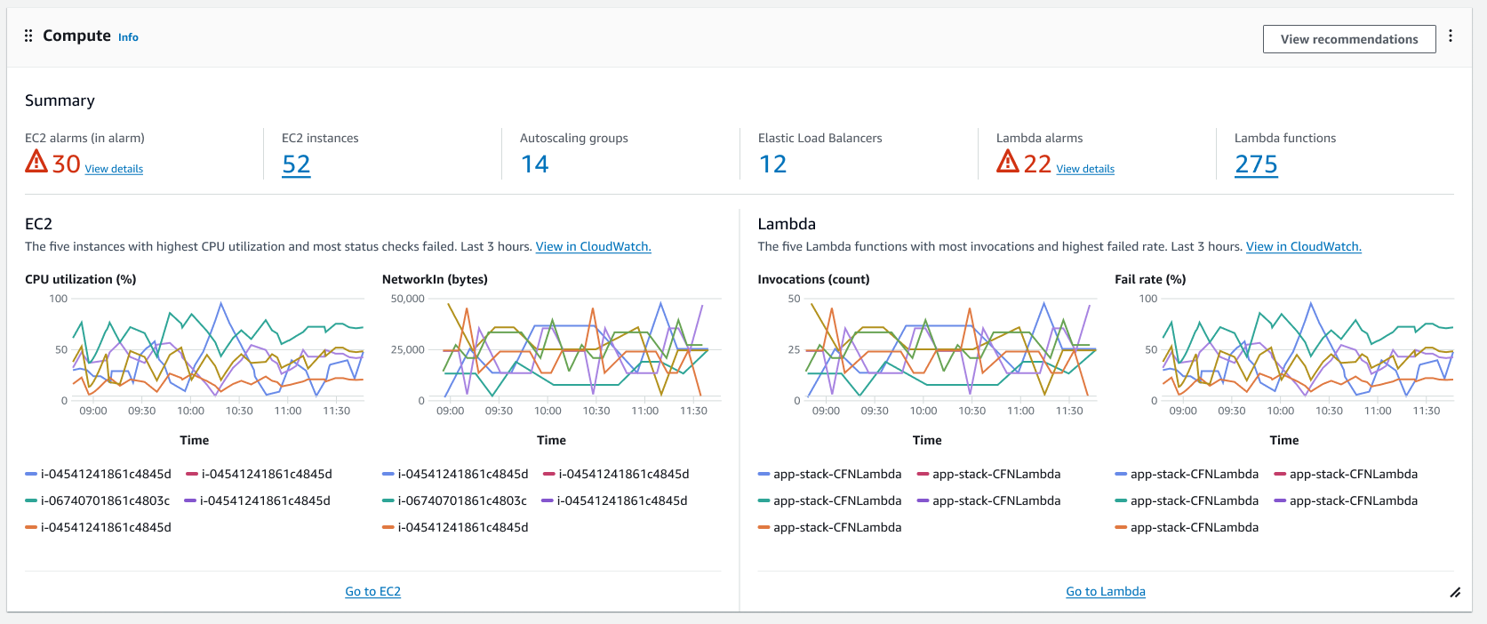 The Compute widget summarizes of application compute resources, information about which are in alarm, and trend charts from CloudWatch showing basic metrics such as Amazon EC2 instance CPU utilization and AWS Lambda invocations. You also can assess application operations, look for anomalies, and take action.