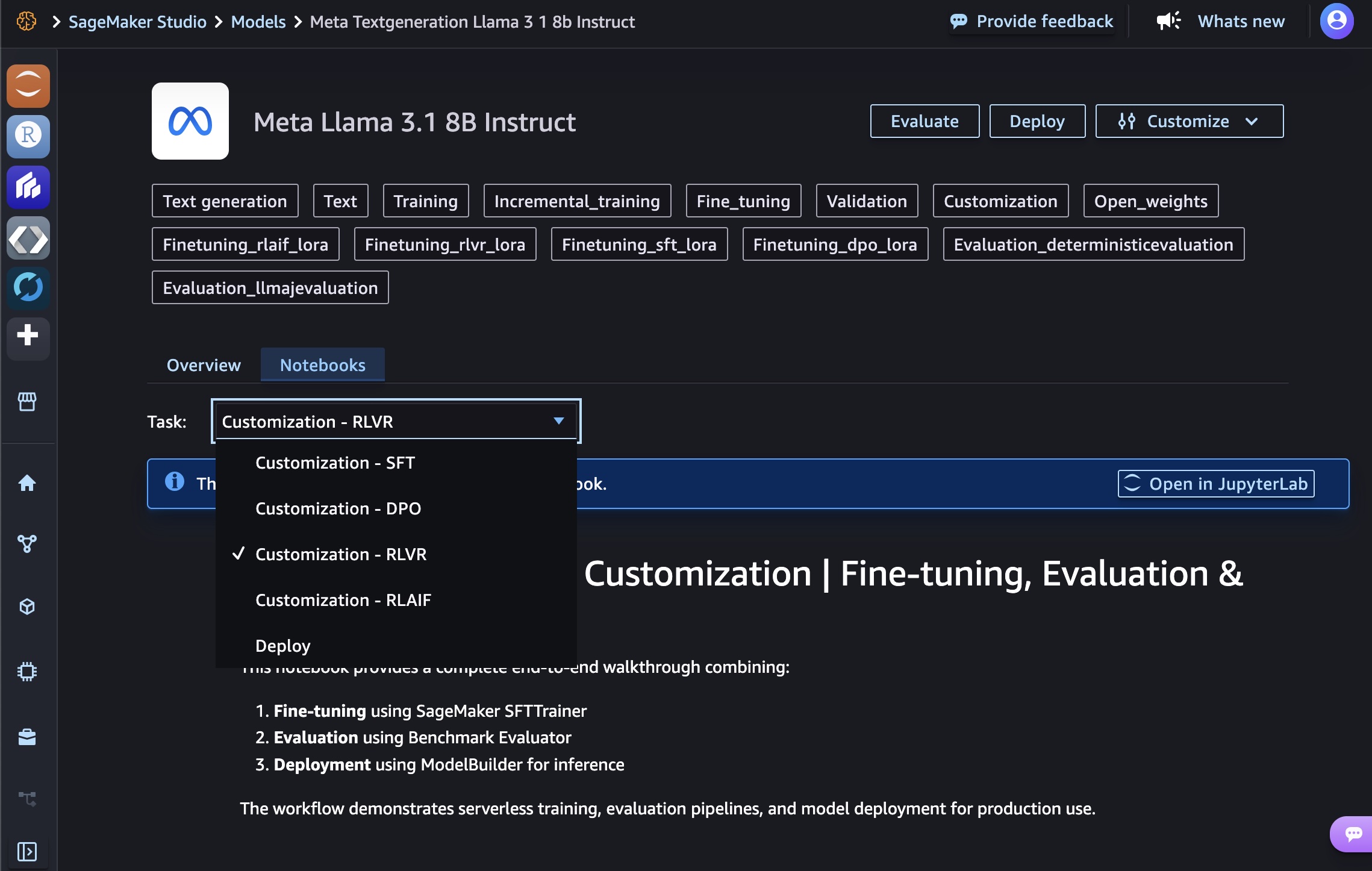 You can get started customizing models in Amazon SageMaker Studio. Choose Models in the left navigation pane and check out your favorite AI models to be customized.