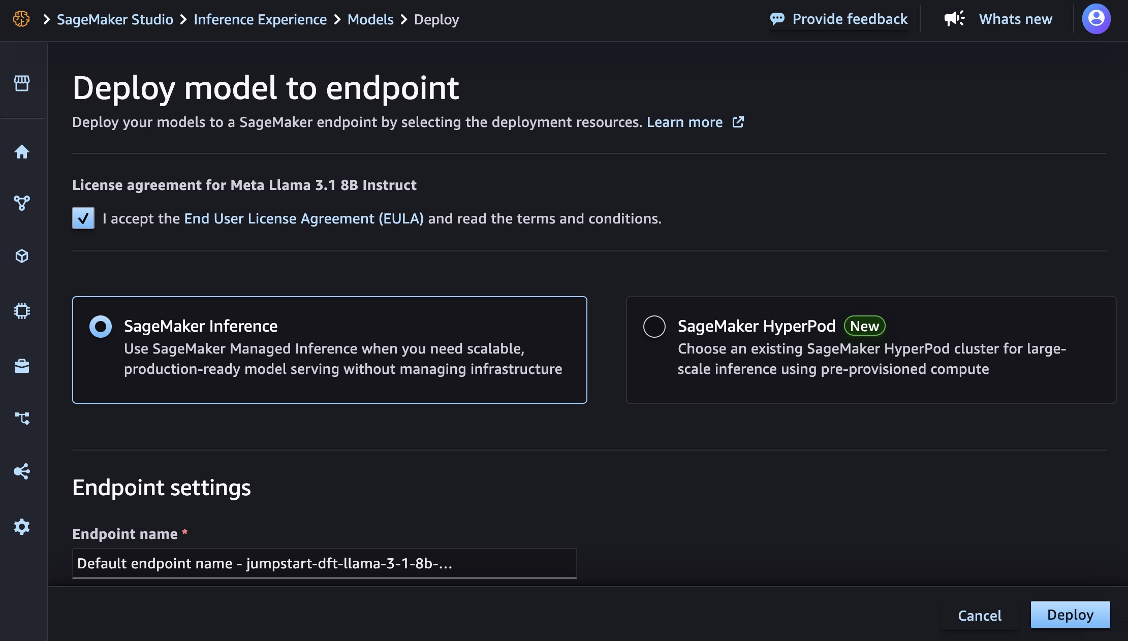 You can choose the Amazon Bedrock or SageMaker AI endpoint by selecting the deployment resources either from Amazon SageMaker Inference or Amazon SageMaker Hyperpod.
