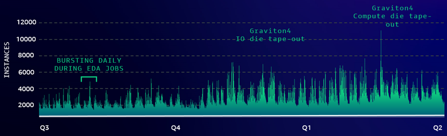 Electronic Design Automation – EDA workloads are central to the process of designing, testing, verifying, and taping out new generations of chips, including Graviton, Trainium, Inferentia, and those that form the building blocks for the Nitro System. AWS and many other chip makers have adopted the AWS Cloud for these workloads, taking advantage of scale and elasticity to supply each phase of the design process with the appropriate amount of compute power. This allows engineers to innovate faster because they are not waiting for results. Here’s a long-term snapshot from one of the clusters that was used to support development of Graviton4 in late 2022 and early 2023. As you can see this cluster runs at massive scale, with peaks as high as 5x normal usage: