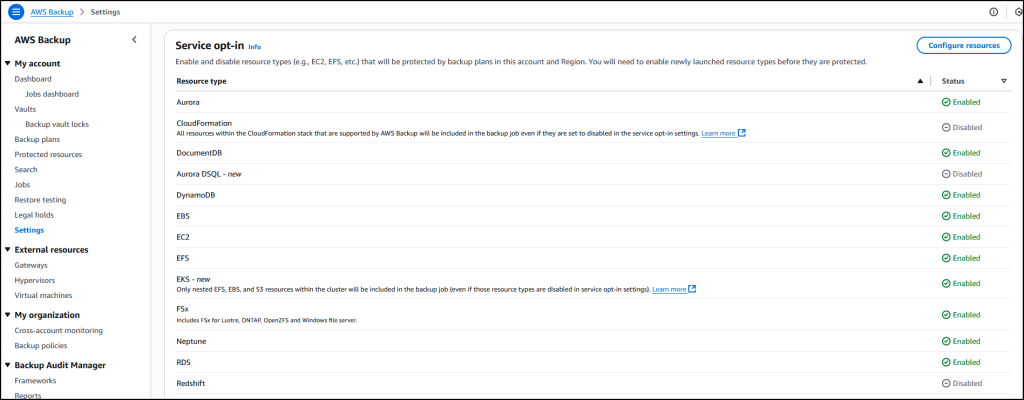 In the AWS Backup console, in the left navigation pane, I choose Settings and then Configure resources to opt in to enable protection of EKS clusters in AWS Backup.