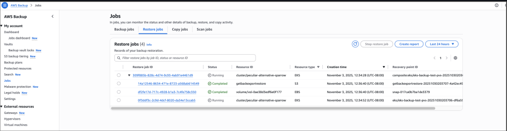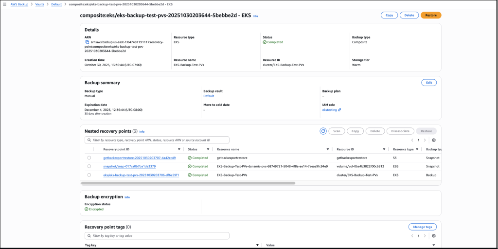 - Restoration of EKS backups is available using the AWS Backup Console, API, or AWS CLI.