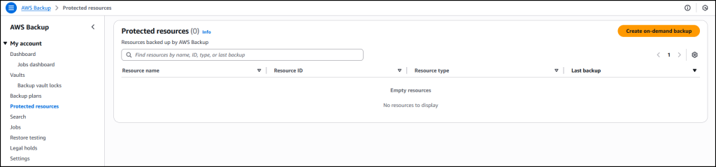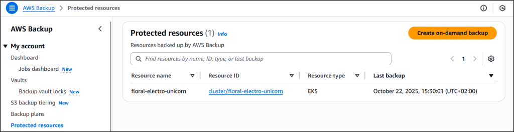 Now that I’ve enabled Amazon EKS, in Protected resources I choose Create on-demand backup to create a backup for my already existing EKS cluster floral-electro-unicorn.