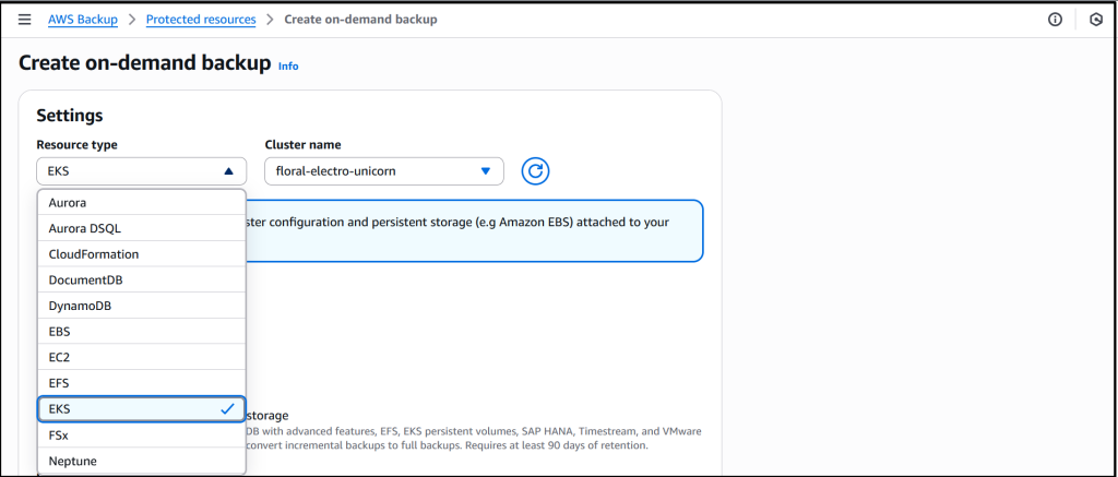 Enabling EKS in Settings ensures that it shows up as a Resource type when I create on-demand backup for the EKS cluster. I proceed to select the EKS resource type and the cluster.