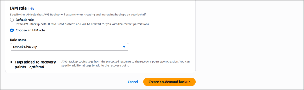 I leave the rest of the information as default, then select Choose an IAM role to select a role (test-eks-backup) that I’ve created and customized with the necessary permissions for AWS Backup to assume when creating and managing backups on my behalf. I choose Create on-demand backup to finalize the process.