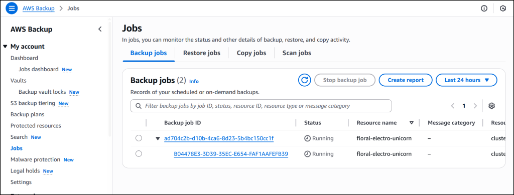The job is completed successfully and now EKS clusterfloral-electro-unicorn is backed up by AWS Backup.
