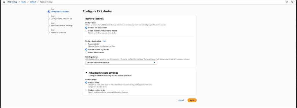 I choose Restore full EKS cluster to restore the full EKS backup. To restore to an existing cluster, I Choose an existing cluster then select the cluster from the drop-down list. I choose the Default order as the order in which individual Kubernetes resources will be restored.