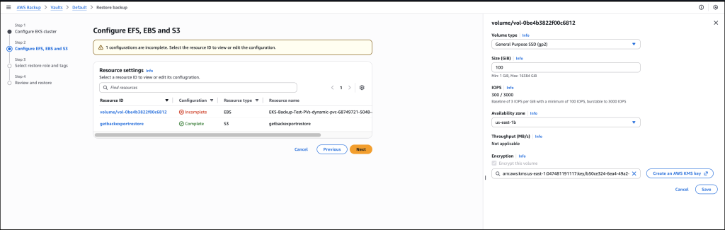 The job is initiated, and it will start running to back up both the EKS cluster state and the persistent volumes. If Amazon S3 buckets are attached to the backup, you’ll need to add the additional Amazon S3 backup permissions AWSBackupServiceRolePolicyForS3Backup to your role. This policy contains the permissions necessary for AWS Backup to back up any Amazon S3 bucket, including access to all objects in a bucket and any associated AWS KMS key.