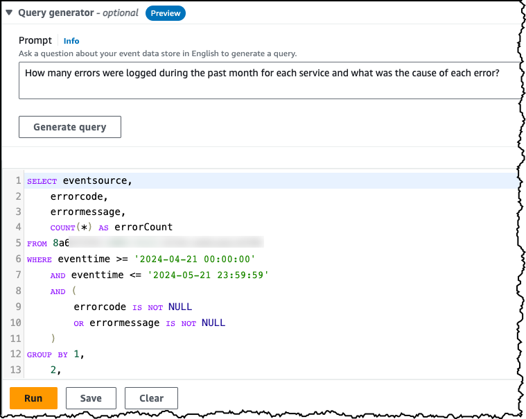 The natural language query generator uses generative AI to produce a ready-to-use SQL query from your prompt, which you can then choose to run in the query editor of CloudTrail Lake.