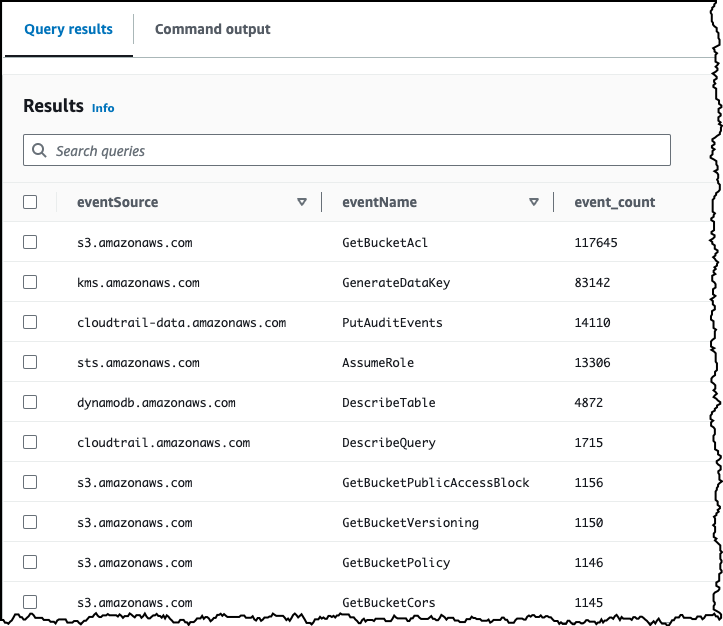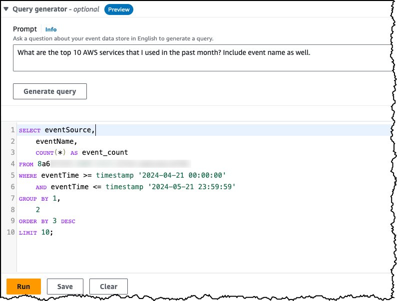 I choose Generate query, and the following SQL query is generated. This SQL statement retrieves the field names (eventSource,eventName, COUNT(*) AS event_count), restricts the rows with the date interval of the past month in the WHERE clause, groups the rows by eventSource and eventName, sorts them by the usage count, and limit the result to 10 rows as I requested in a natural language.