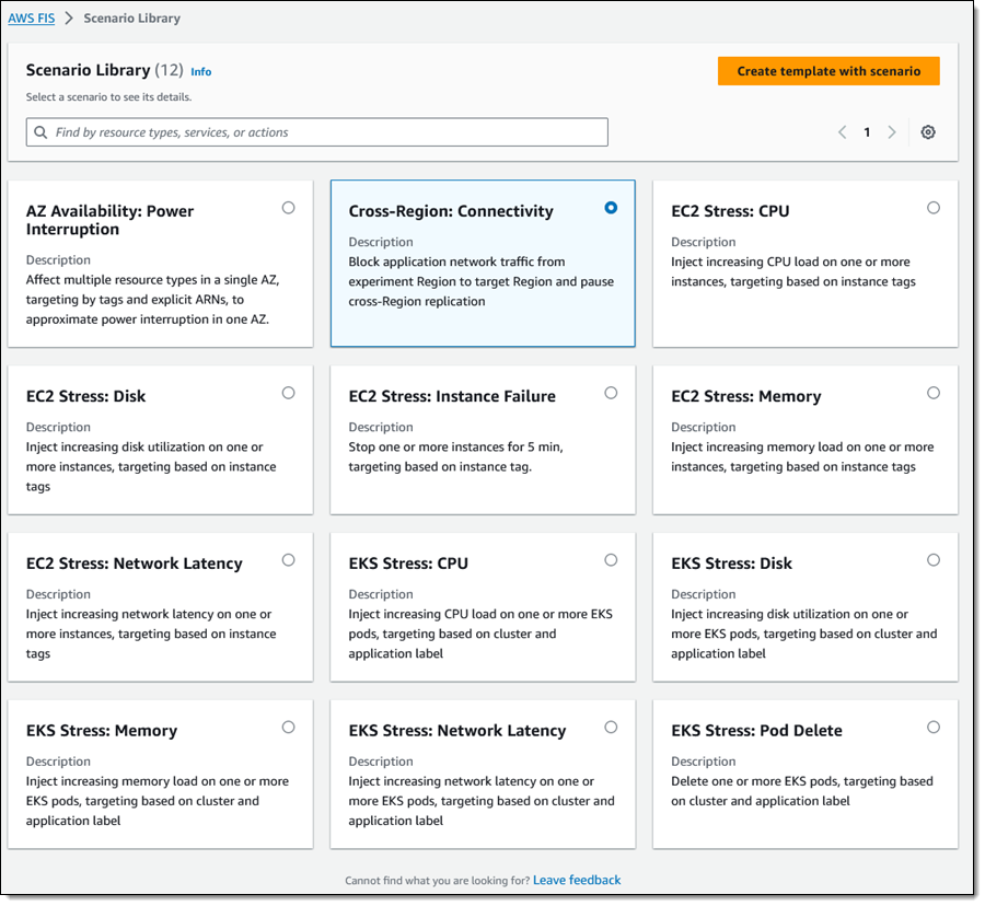 With these actions as building blocks, we recently launched the AWS FIS Scenario Library. Each scenario in the library defines events or conditions that you can use to test the resilience of your applications: