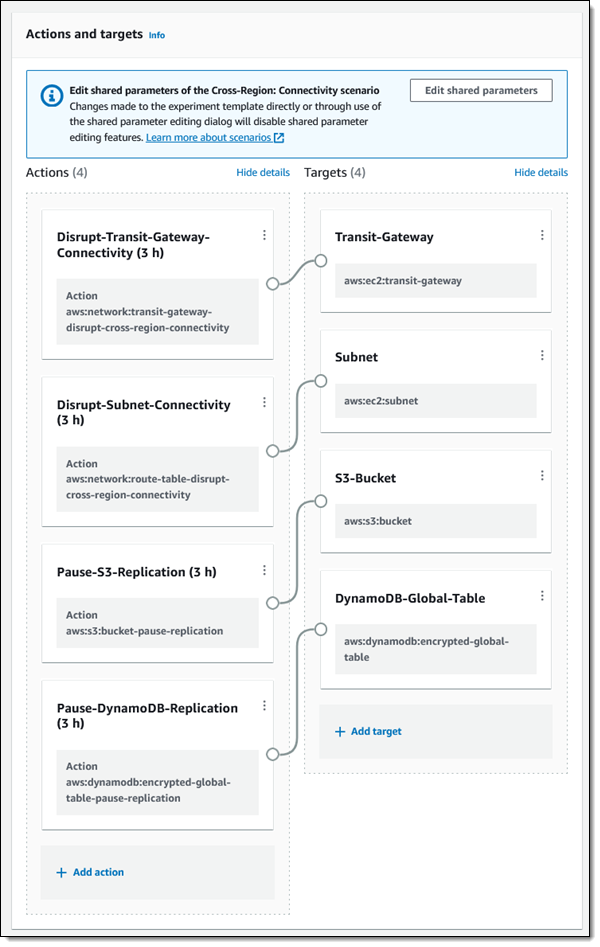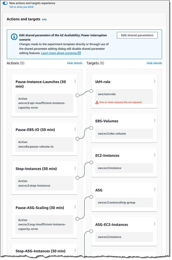 The New actions and targets experience makes it easy to see everything at a glance — the actions in the scenario and the types of AWS resources that they affect: