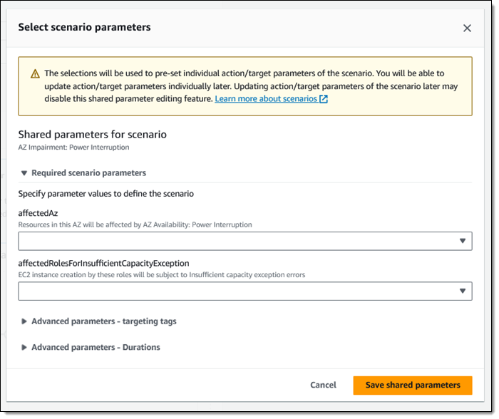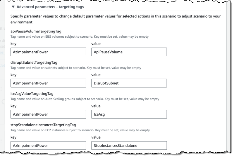 The Advanced parameters – targeting tags lets you control the tag keys and values that will be used to locate the resources targeted by experiments: