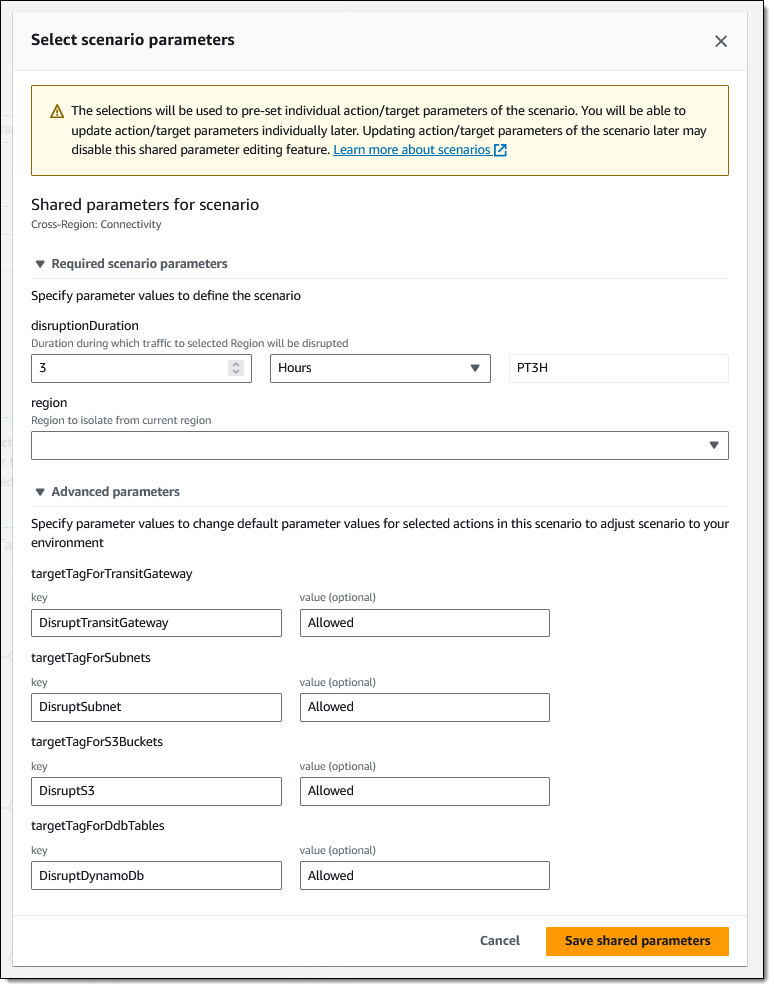 This scenario runs for 3 hours (unless you change the disruptionDuration parameter), and isolates the test region from the target region in the specified ways, with advanced parameters to control the tags that are used to select the affected AWS resources in the isolated region: