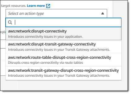 Cross-Region: Connectivity – This scenario prevents your application in a test region from being able to access resources in a target region. This includes traffic from EC2 instances, ECS tasks, EKS pods, and Lambda functions attached to a VPC. It also includes traffic flowing across Transit Gateways and VPC peering connections, as well as cross-region S3 and DynamoDB replication. The scenario looks like this out of the box: